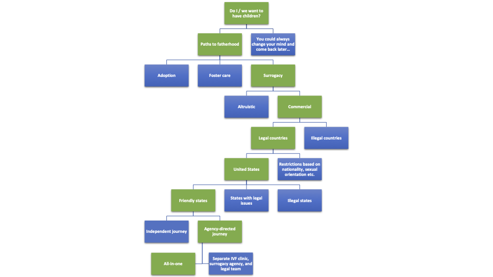 This diagram shows the decision tree and options that we have currently discussed on our path to fatherhood. The green boxes show our chosen path. I will walk you through these decisions in the sections that follow, but I wanted to mention that I will not discuss a key element to this process at this time, and that is finances. This is an integral part of the process of becoming a father as a queer man, but I wanted to first write about the thought process without the financial factor. I will revisit the finances of these decisions in a later article.