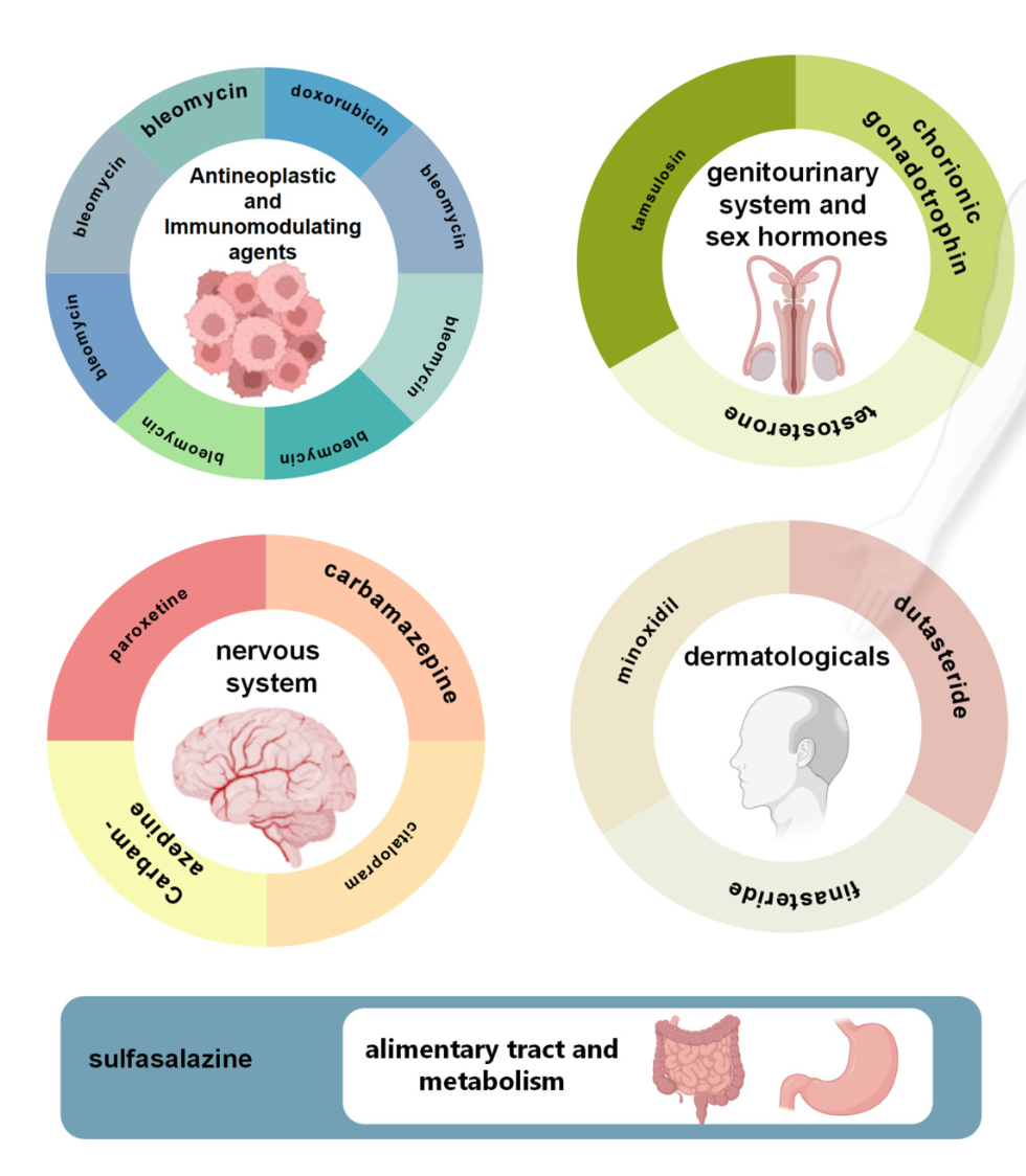 Chemotherapy medications (antineoplastic and immunomodulating agents in the picture above) as well as hormonal treatments like testosterone (genitourinary system and sex hormones in the picture above) are not surprising categories to have shown up in these real world data. The implications of these medications on male fertility has been well described.